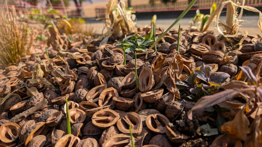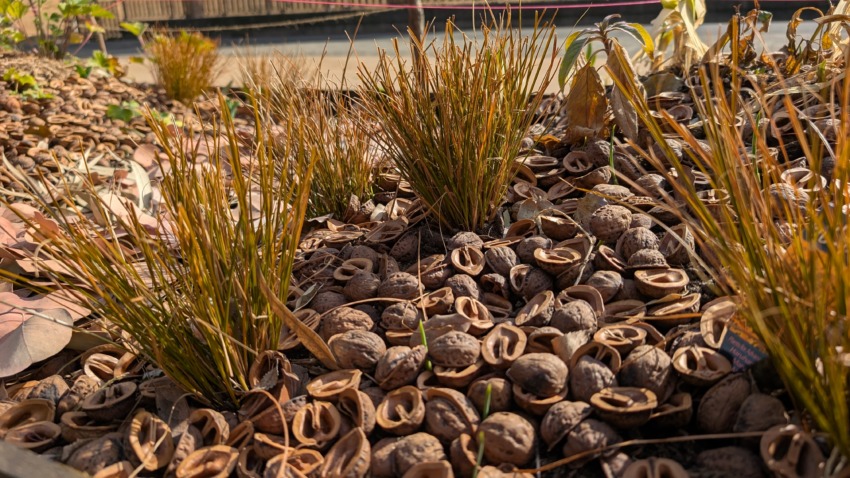 クルミの殻を押し上げる勢いで成長しており、春の開花が期待されます。