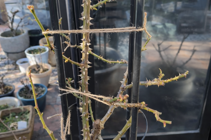 葉っぱを落としてある程度枝を剪定したら、誘引を一度外します。