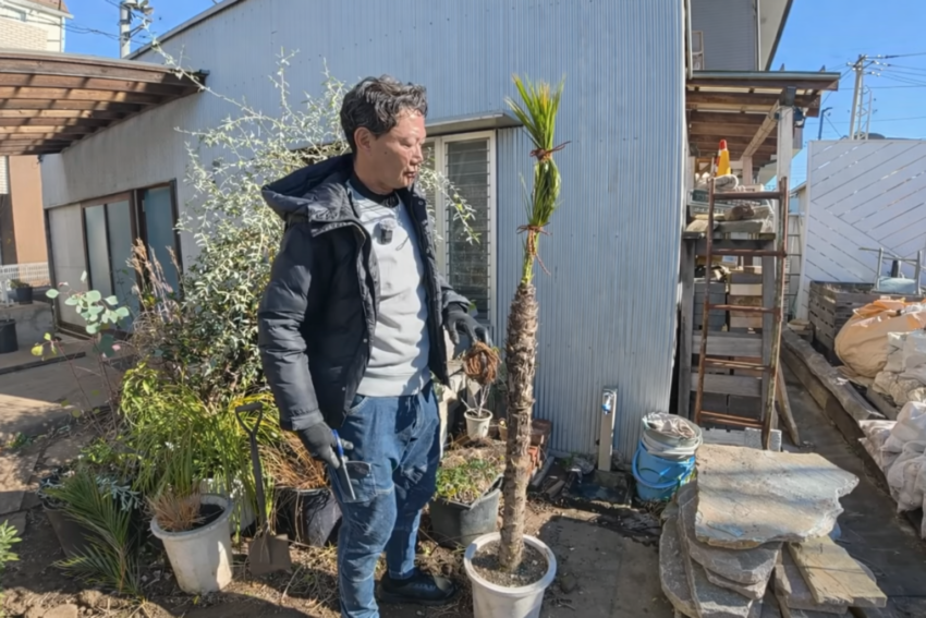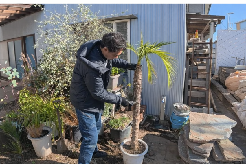 幹の部分は既に皮が厚くなり、フサフサがついて自分を守っているため、葉の部分、特に芯の部分を保護しましょう。