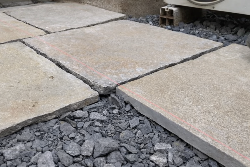 自然石の間のスリット(隙間)には、砂利を入れて仕上げました。水の逃げ道を確保し、見た目も綺麗に整い、水勾配も保たれます。