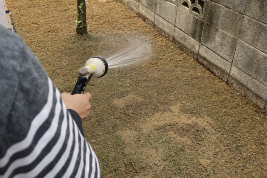 たっぷり水をあげましょう。水をかけることで砂がなじみ、芝生が見えてきます。この散水によって目地砂が落ち着き、芝生がしっかり定着します。
