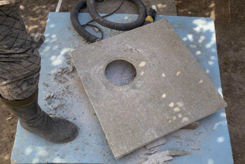 排水マスがある場所は、石をくり抜く必要があります。排水マスの蓋より5mm〜1cm大きくくり抜き、手作業で丁寧に整え、すんなりはまるサイズに調整する工程です。