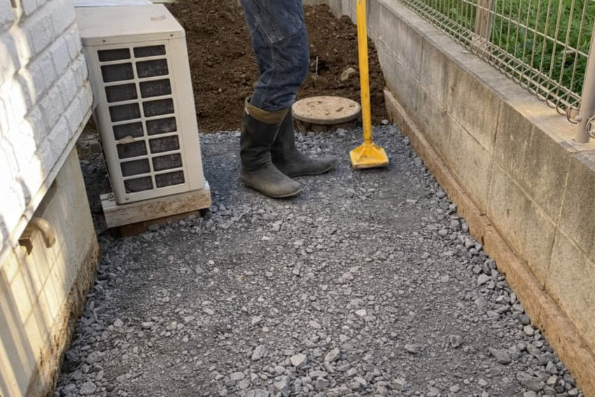 玄関アプローチに繋がる日陰のエリアには、自然石を敷きます。まず行うのは、砕石(路盤材)を5cm敷き、広げて転圧する作業です。カチッと固まるまで叩くことで、石の安定性が決まります。