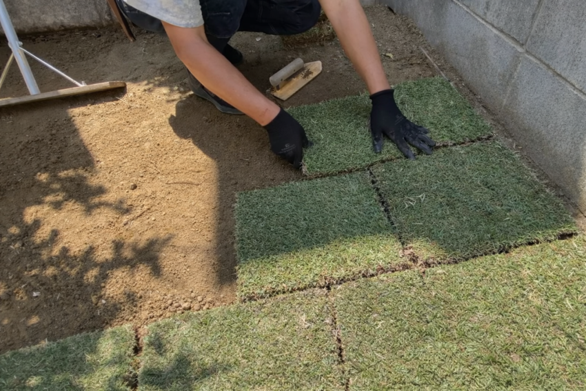 TM9芝生は互い違いに並べるのが重要です。レンガを積むように配置して継ぎ目をずらすことで安定し、芝生が定着しやすくなります。