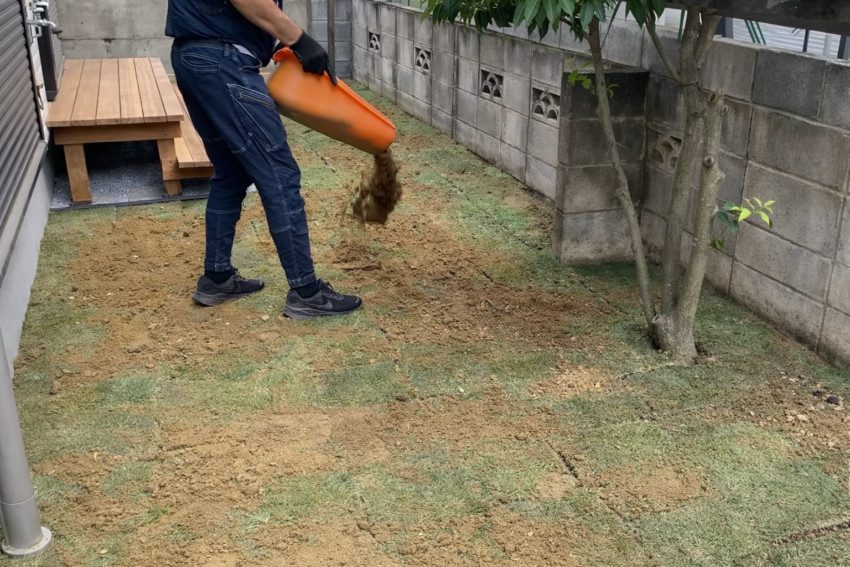 芝生同士の隙間を埋めるため、目地砂を撒きましょう。ホウキでなじませ、砂が隙間に入り込むよう整えます。