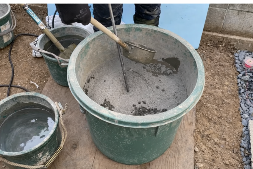 通常のモルタルがバケツ2杯の水を使うのに対し、バサモルはバケツ1杯程度の水で作ります。