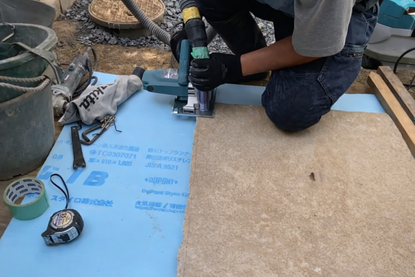 スタイロフォームの上でカットすれば、石と一緒にスタイロフォームも切れるため、安定した作業ができます。