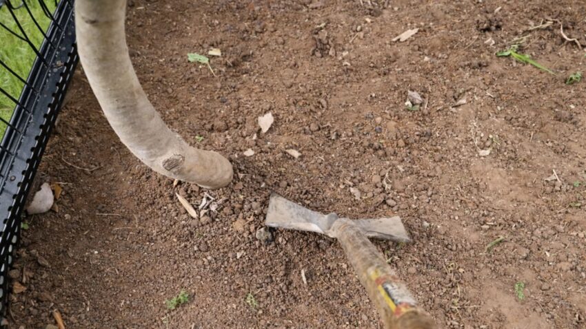 一方、縦向き(木に向かって垂直)に掘ると、根を真上から切ろうとする形になり、スコップが根にぶつかって全く進みません。