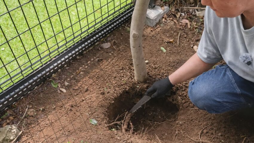掘り進める中で太い根が出てきたら、周囲の土を取り除いて根を露出させ、のこぎりで切断します。